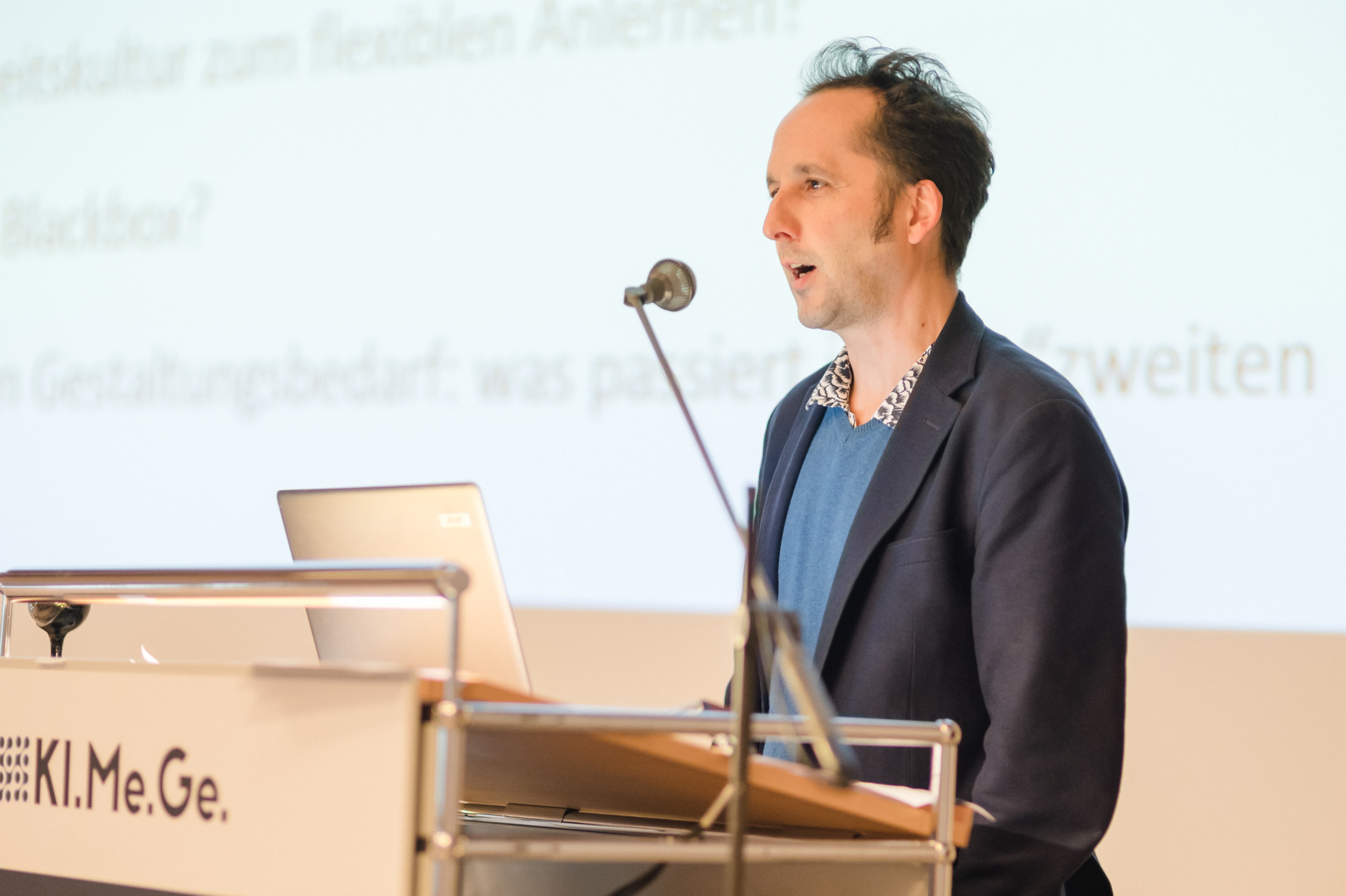 Der zweite Konferenztag wurde mit einer Keynote von Prof. Dr. Werner Rammert eröffnet. In seinem Vortrag ließ er die mehr als 30-jährige Geschichte der sozialwissenschaftlichen Forschung zu KI Revue passieren und entwickelte Thesen zur Zukunft von KI.